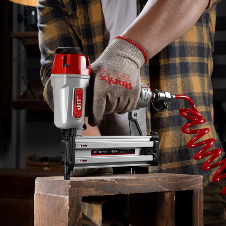 میخکوب اسکا 1850 جیت با خشاب آنادایزشده و گیج 18 برای میخهای 15 تا 50 میلیمتری مناسب است. این میخکوب همراه با متعلقات ضروری ارائه میشود که شامل ظرف روغن برای کاهش استهلاک ابزار، کوپلینگ برای اتصال به شلنگ هوا، شلنگ 7.5 متری برای دسترسی آسان به مناطق کاری مختلف، آچار آلن برای تنظیم و تعمیر ابزار و قلاب برای نگهداری ابزار است.