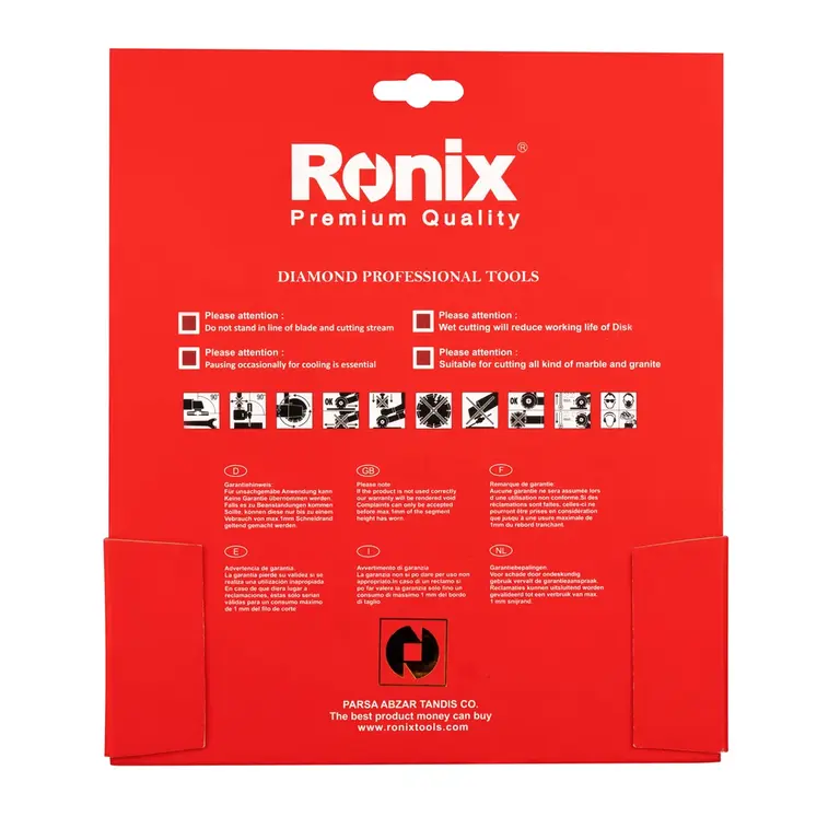 فرز سنگبری و صفحهی گرانیتبر، برای برش گرانیت در کاربردهای ساختمانی نظیر نمای ساختمان مورد استفاده قرار میگیرند. صفحه گرانیتبر 230 میلیمتری RH-3510 رونیکس، مطابق استانداردهای TUV و CE اروپا و با روش cold pressتولید شده است که موجب بالارفتن مقاومت آن در برابر فشار حاصل از کار بر سطوح متراکم گرانیت و سنگ مرمر میشود.