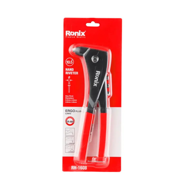 انبر پرچ RH-1608 رونیکس سیستم پرچ متمایزی دارد که موجب پرچ سریعتر قطعات میشود. این انبر بدنهای از جنس آلیاژ آلومینیوم و فولاد دارد و ابزاری حرفهای است که میتواند از هر سه نوع پرچ آلومینیومی، فولادی و استیل استفاده کند.