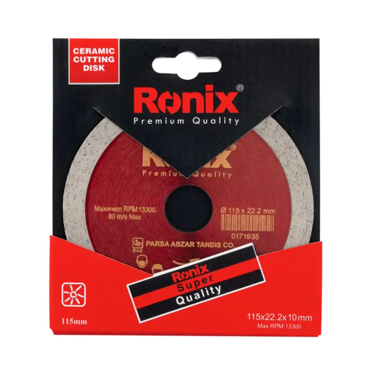 صفحه سرامیکبر یکی از متعلقات ابزارآلات برشی و پرکاربرد است. در تولید این صفحه باید از مواد باکیفیت استفاده شود؛ چراکه دقت برش بالا میرود و از پرش صفحه در زمان برش قطعات کار سخت و متراکم جلوگیری میکند. صفحه سرامیکبُر 115 میلیمتری رونیکس مدلRH-3507 از مواد اولیه باکیفیت و با فناوریهای پیشرفته تولید شده که این مسأله قدرت برش این محصول را در انواع سرامیک افزایش داده و طول عمر بالای آن را به همراه دارد. این قطعه برشی رونیکس یکی از بهترین و کارآمدترین متعلقات ابزارآلات برشی موجود در بازار ابزار ایران است و کاربر را از نمونههای به ظاهر مشابه و درواقع بیکیفیت بینیاز میکند. برای ایجاد برشی سریع و دقیق روی سرامیک باید صفحه برشی در اختیار داشت که ابعاد آن مطابق با استانداردهای جهانی تنظیم شده باشد. این صفحه سرامیکبر رونیکس دارای قطر 115 میلیمتری، ارتفاع سگمنت 10 میلیمتری و قطر سوراخ وسط 22.2 میلیمتری است. تمام این موارد، در کنار سرعت چرخشی بالغ بر 13300دور در دقیقه این صفحه سرامیکبر را به عنوان محصولی نمونه به بازار ابزار ایران و جهان معرفی کرده است.